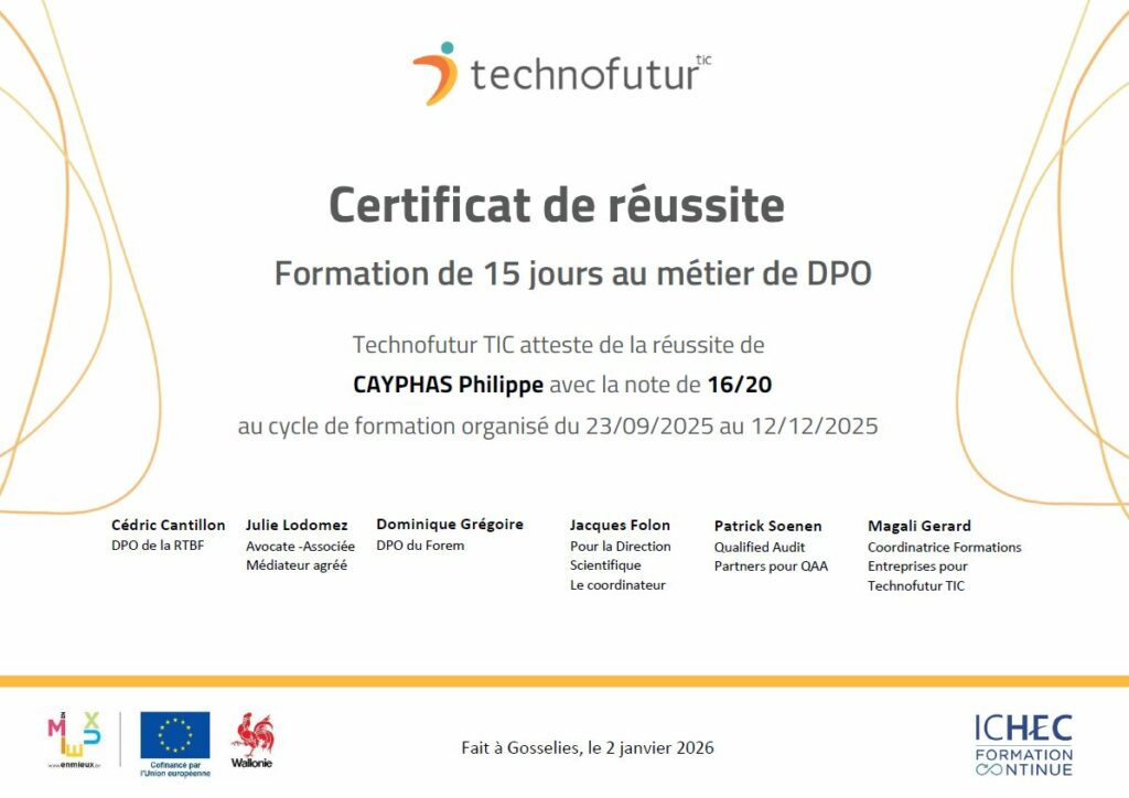 Dans mon parcours professionnel, j’au eu l’occasion de travailler comme responsable informatique d’un CPAS. Toutes les adminsitrations publiques doivent disposer d’un DPO. J’ai récemment décidé de me former et me certifier comme DPO pour le secteur public. Une corde de plus à mon arc.